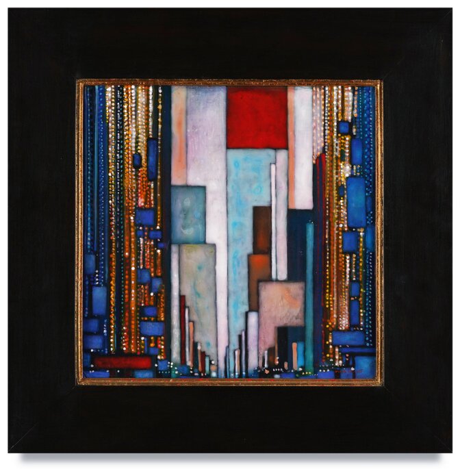 But sometimes, Innerst’s external structures seem to pull themselves into orderly geometric colors recalling Piet Mondrian. Some of the works, like “Tiffany,” toss in falling streams of Klimtian jewels and glitter. “Beneath a Canopy of Lights” stretches the Klimt coloration into a tight-focused, vertical skyline portrait that verges on abstraction.