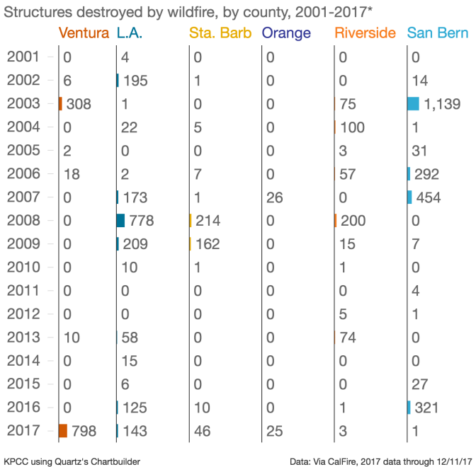 Los Angeles, Riverside, San Diego and San Bernardino Counties all had multiple fires that were more destructive during that same period.