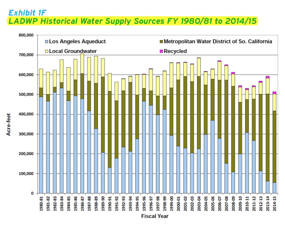 Our imported water comes two primary sources. One is from the eastern Sierra Nevada via the Los Angeles Aqueduct, which the city owns. The second is purchases from the Metropolitan Water District, a regional wholesaler, which gets water from the Colorado River and Northern California.