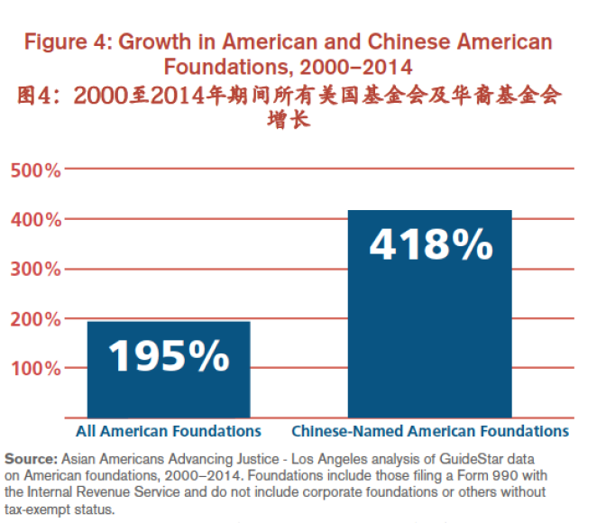The number of Chinese-American foundations in the U.S. rose to nearly 1,300 between 2000 and 2014, a 418 percent jump compared to 195 percent for the general population.