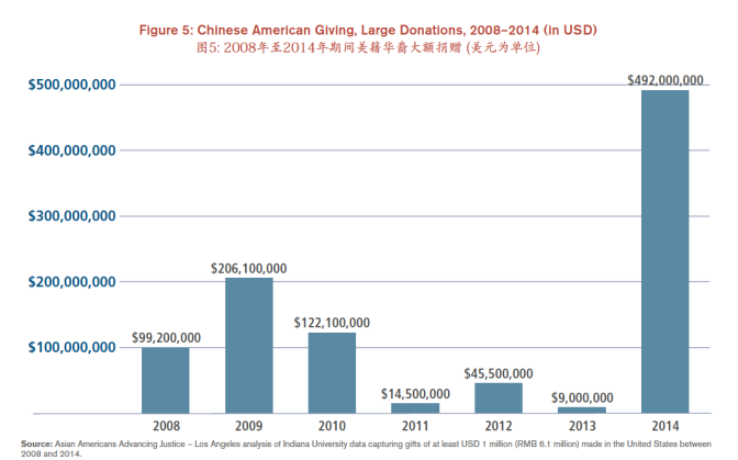 The research also showed that major gifts by Chinese-Americans increased almost five-fold between 2008 and 2014 to nearly $500 million. In 2014, a pair of brothers Gerald and Ronnie Chan alone gave $350 million to Harvard University’s School of Public Health, at the time the largest gift in the school's history.