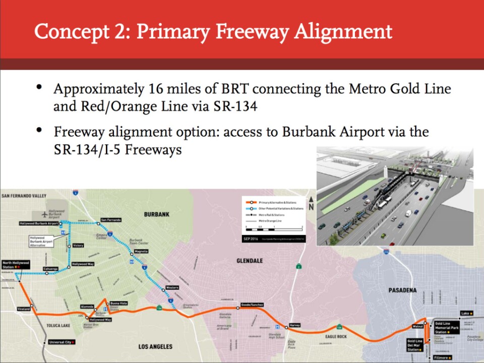 The Metro board recently released a technical study which proposes two options for the route. The first would serve more potential riders and destinations by routing on surface streets. The second would be a bit faster but more limited by traveling mostly on the 134 freeway.