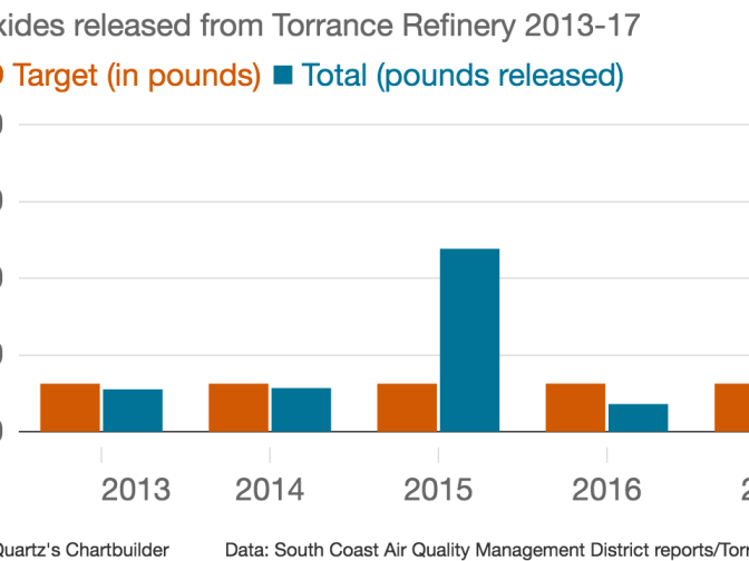 The Torrance Refinery put out a high amount of SOx between April and June during a renovation of the plant, said Barbara Graham, spokeswoman for PBF Energy. She said the gas being burned was mostly hydrogen, but that it mixed with other gases in the flare itself, creating the high SOx emissions.