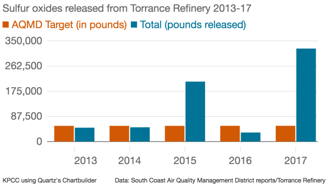 The refinery is required to keep its SOx level below about 55,000 pounds annually, but the refinery has already released 323,370 pounds so far this year, according to the agency's report.