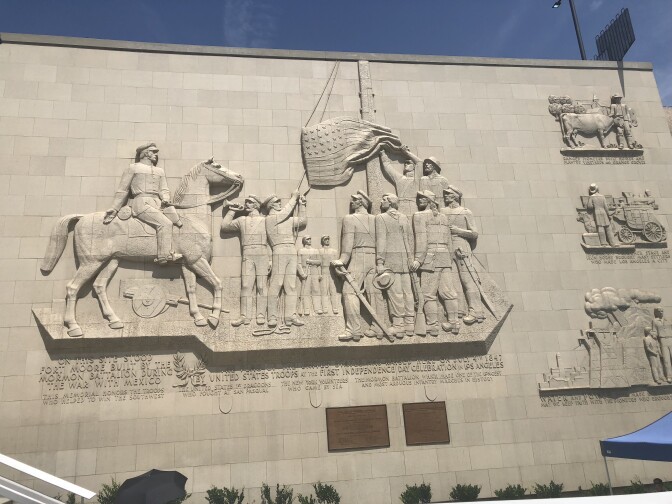 The memorial, on Hill Street between Chinatown and Grand Park, depicts a ceremonial flag being raised over what was then Fort Moore on July 4, 1847. It features a glazed terra cotta bas-relief mural that stands more than 230 feet high, an 80-foot waterfall, an almost 70-foot-tall pylon with a giant eagle, and a flagpole. In 1977, the waterfall was shut off due to drought, and the rest fell into disrepair.