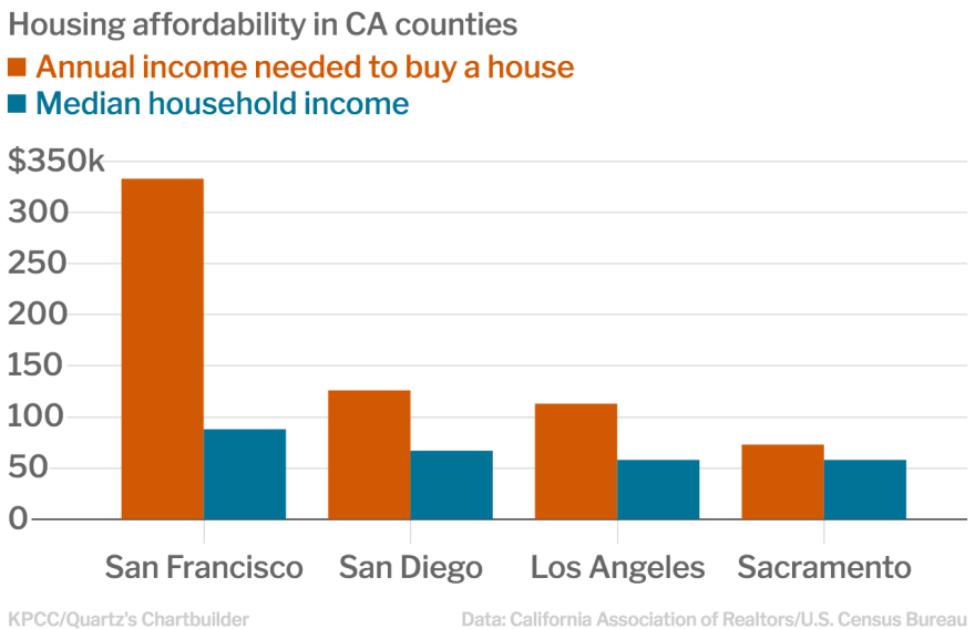 It currently takes an annual household income of $112,930 to afford a median-priced Los Angeles home, according to a recent report from the California Association of Realtors. Homes in other parts of the state are significantly cheaper -- like the Inland Empire east of Los Angeles -- but in San Francisco, homebuyers need to earn as much as $333,270 to keep up with median monthly home payments.