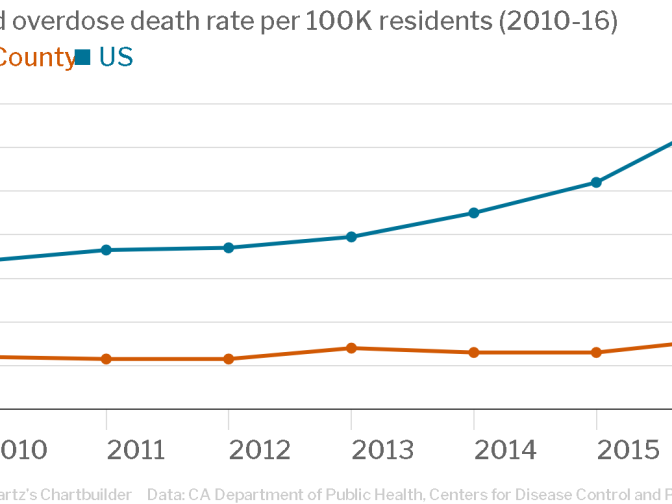 Los Angeles County has not gone unscathed. But the rate of deadly overdoses here is much lower than the national rate. In 2016, the county had a rate of opioid overdose deaths of 3.2 per 100,000 people. The national rate was 13.3 per 100,000 people.