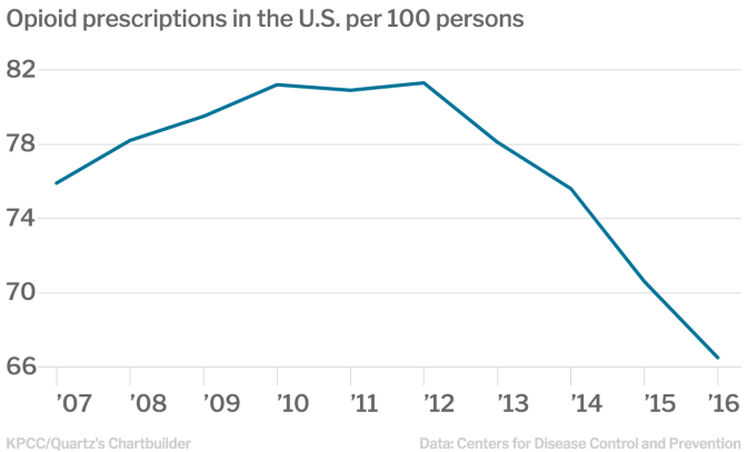 It worked: Prescriptions for high-dosage opioids dropped nearly 50 percent between 2008 and 2016, according to the CDC. Prescriptions for all opioids dropped 18 percent from the high point in 2012. That year there were more than 255 million opioid prescriptions, the equivalent of 81 per every 100 persons.