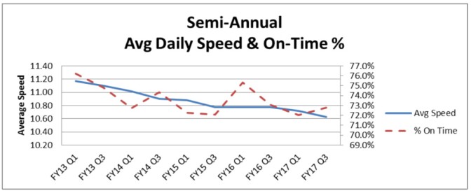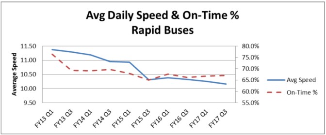 On-time performance has also suffered. Metro has adjusted schedules to reflect the increased traffic delays, but buses have continued to fall behind in the last year and a half, particularly on Metro’s Rapid bus lines. The lines are intended to provide faster express service on busy routes.