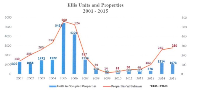 The Ellis Act lets landlords evict tenants if they want to put up a new building or convert apartments to condominiums. They invoked the law to take nearly 1,100 units off the market in 2015 alone.
