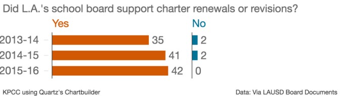 But while L.A. Unified leaders are denying applications for new charters at a higher rate this year, renewals for existing charter schools are a different story. This year, the district's Charter School Division has supported 41 of 42 bids to renew or revise a school's charter. The board ultimately voted to support all 42 applications.