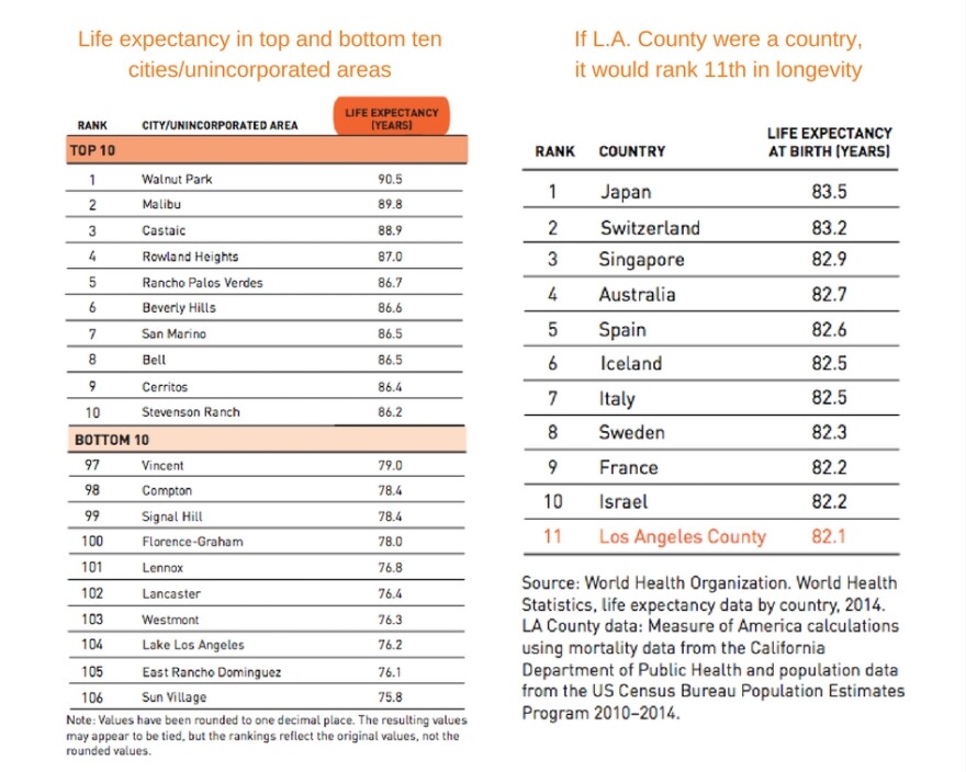While the researchers revealed stark discrepancies between life expectancy in different areas of the county, overall the region stacks up impressively against other nations. If L.A. County were a country, its 82.1-year average lifespan would rank close to those of Israel and France.