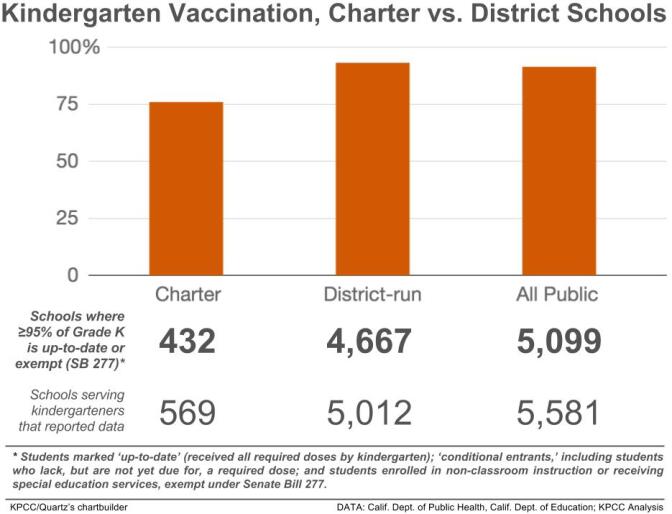 Seventh graders in California charter schools were significantly less likely than their peers in district-run public schools to have received all of the vaccinations state law requires last year, KPCC reported last week.