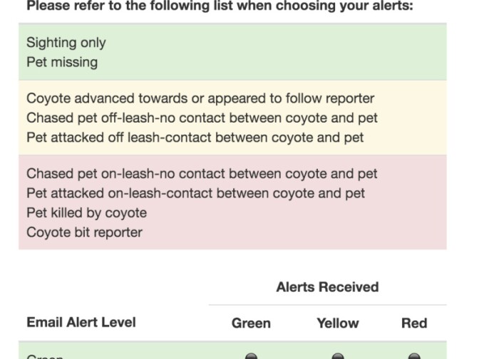 You can choose how much information you want to receive about coyotes. Only the most severe attacks? Severe attacks and reports of coyotes following people or attacking off-leash pets? Or all of the above plus coyote sightings?