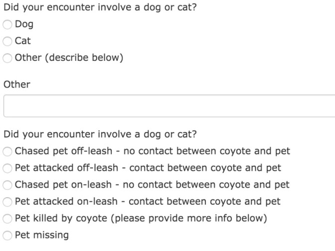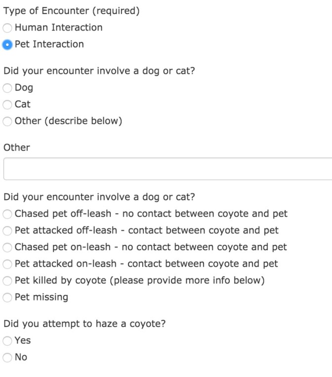 Reporting a coyote encounter on the Coyote Cacher is an exercise in specificity. You will first be prompted to choose whether it was a human or pet interaction. If human, did you see the coyote? Did it follow you? Did it actually bite you?
