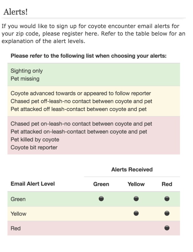 The Coyote Cacher doesn’t just take in information, users can also sign up for email alerts about coyote sightings and attacks in their neighborhoods by entering their zip code.