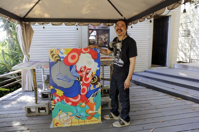 The L.A. Public Library is issuing new art cards that feature a painting of a Japanese folklore character by artist Gajin Fujita, who grew up going to his public library in Boyle Heights.
