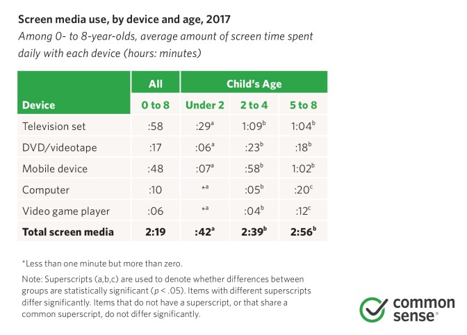 The Common Sense Census, which surveys 1,400 families around the country, has been tracking media use for kids 8 and under since 2011. This year, it found that they spend an average of 2 hours and 19 minutes with screens each day, roughly the same as in previous years. The difference now is what kids are doing.