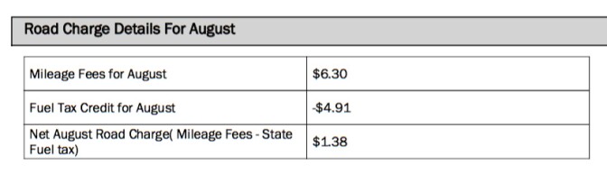 The experiment, the California Road Charge pilot, kicked off in July. I signed up and just received my first bill (although I checked my progress on my smartphone earlier in August).