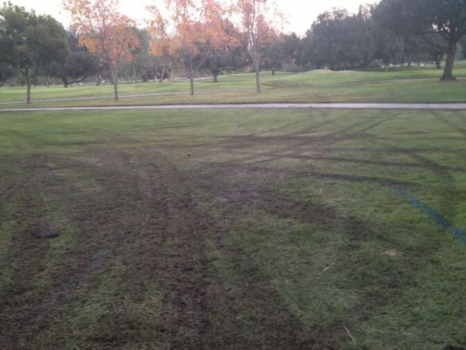 Indeed, near the stadium in the Arroyo Seco is the Rose Bowl Aquatics Center, Kidspace Museum, and the Brookside Golf Course. On UCLA game days, and during the Rose Bowl, those facilities are closed. The golf course serves as a parking lot. Two days after this year's UCLA-USC game on a rainy Saturday, tire tracks marked the fairways.