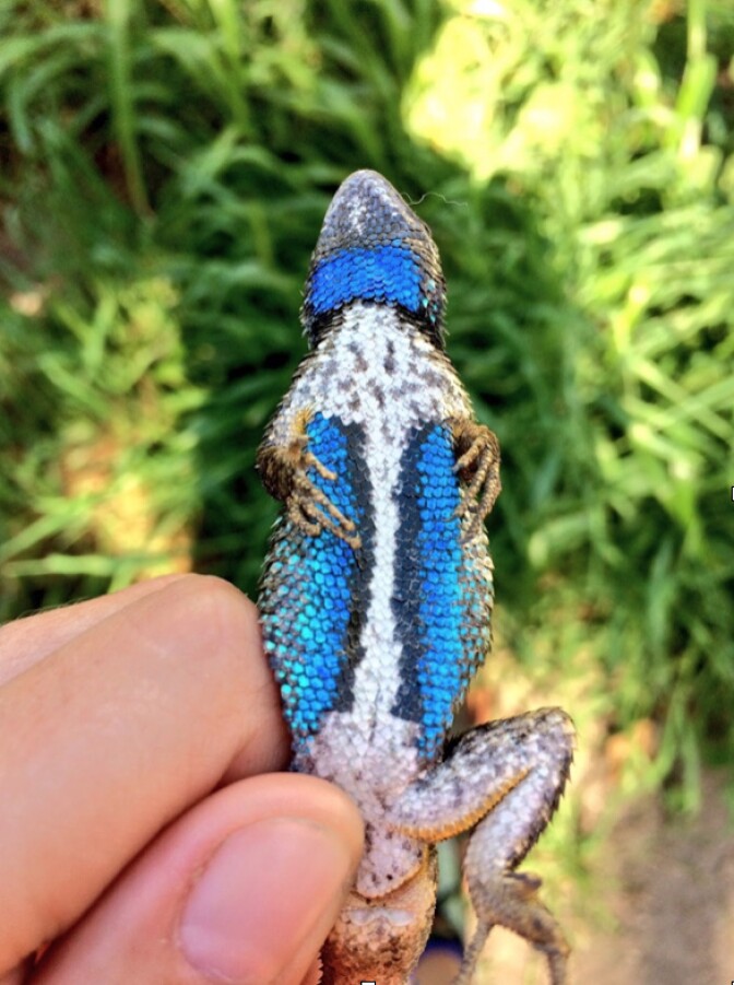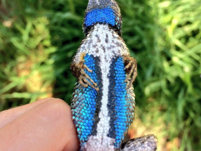 Male lizards of this species have bright blue markings on the throat and abdomen - and Putman hypothesized she could more easily catch them if she wore a similar color.