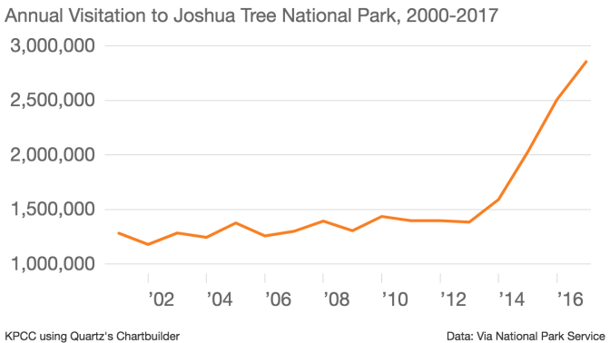 Like many national parks, Joshua Tree had its busiest year ever in 2017. More than 2.8 million people wandered the boulder strewn trails, taking selfies in front of Joshua Trees, cholla and other desert plants. Visitorship is more than double what it was five years ago.