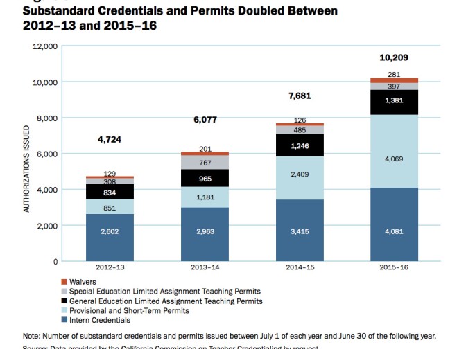 To bridge the supply-demand gap, the state was forced to issue more than 10,000 "substandard" teaching credentials during the 2015-16 school year — more than twice the number issued just four years earlier, the researchers found.