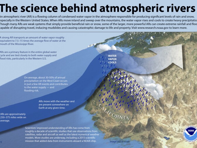 The gigantic amount of water barreling towards the area is called an atmospheric river. A storm system that begins far out at sea and gathers abundant moisture as it travels towards land, often driven by high winds. Atmospheric rivers can be bigger than 300 miles across, hold more than 10 times the amount of water found in the Mississippi River, and they can be both a boon and a threat to the state.