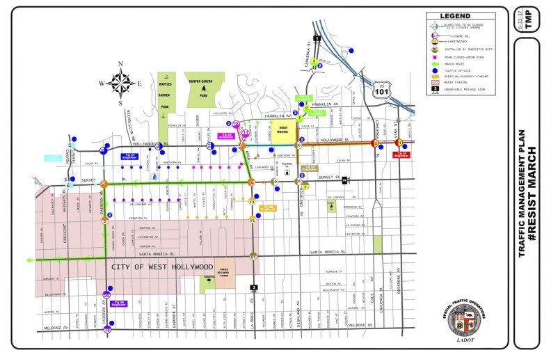 According to the Los Angeles Department of Transportation, the Resist March will start at Hollywood Boulevard and La Brea Avenue, turn south onto La Brea Avenue, then head west on Sunset Boulevard before turning south onto Fairfax Avenue. From there, walkers will make a westbound turn onto Santa Monica Boulevard heading into West Hollywood to reach the final destination of the LA Pride festival.