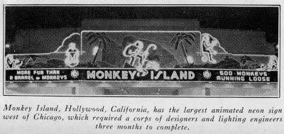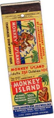 Heavily promoted to tourists as a place where one could rub elbows with Hollywood stars and celebrities, Monkey Island took strong advantage of its Hollywood location. This from the guide book: ' Nowhere else in Hollywood can the visitor to Southern California come closer to the screen celebrities than at Monkey Island. There are no police, no ropes, no barriers between the great people of the cinema and those who come to Hollywood to view them at close range.'