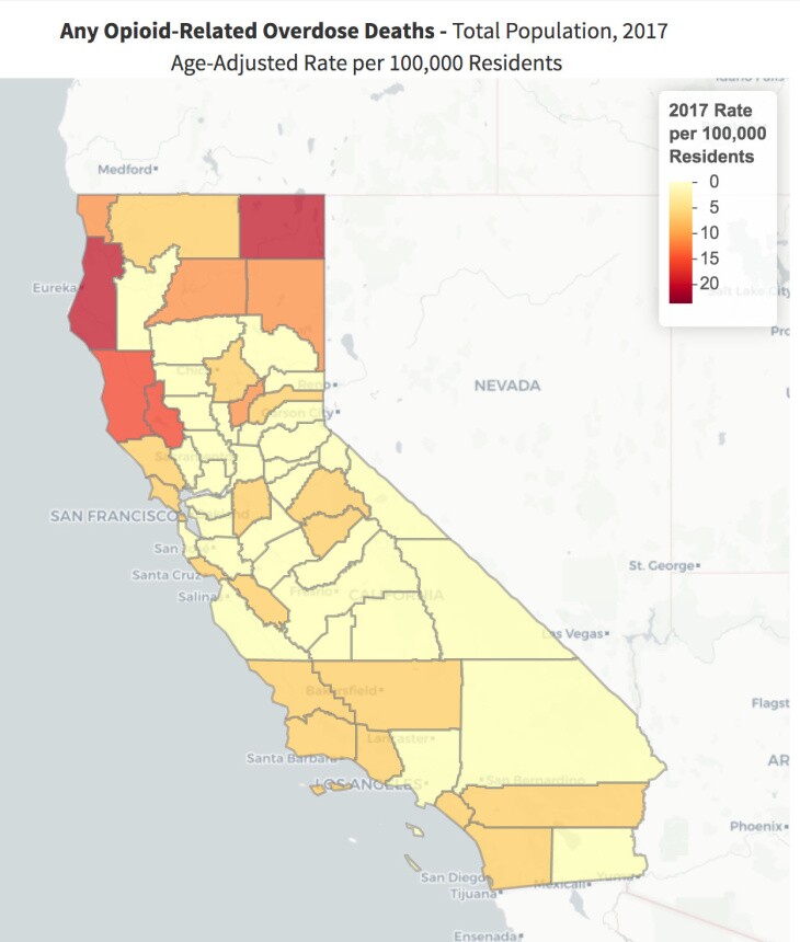 The California counties with the highest rates of opioid overdose deaths and hospitalizations are concentrated in the northern, mostly rural parts of the state, according to the Public Health Department's opioid data dashboard.