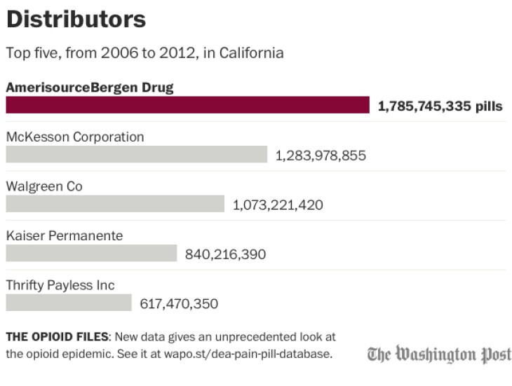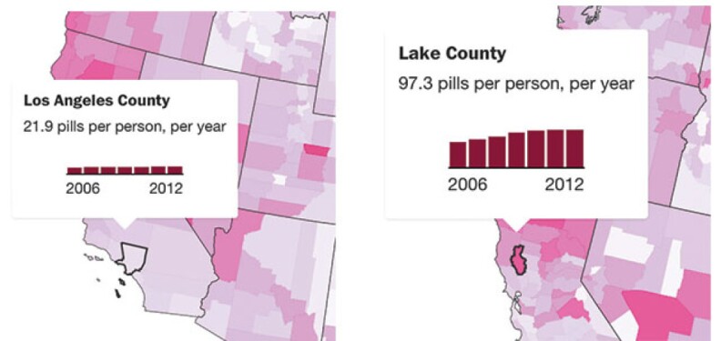 Manufacturers distributed more than 8 billion pain pills within the state over a six year period. The most pills per capita went to Lake County, a small, rural county northwest of Sacramento. Enough pills were sent to the county to supply each of its 65,000 residents with 97 pills per person per year.