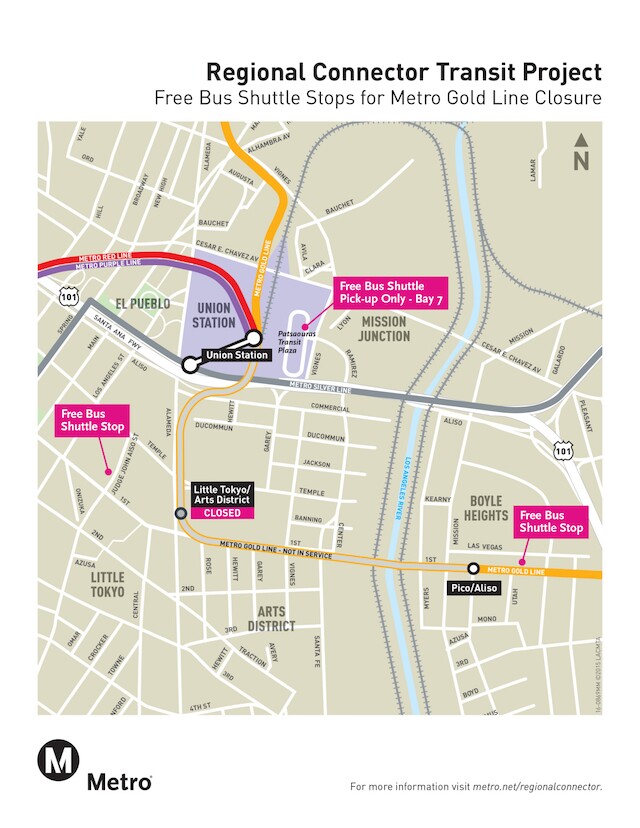 From Friday, Jan. 8 at 9 p.m. until March of 2016, the Gold Line's Little Tokyo/Arts District station will be closed. There will be bus shuttles that will replace the train service between Union Station and the Pico/Aliso Station. These shuttles will run every six minutes at peak times during the week, and then every 10 minutes at night and on weekends. You can get on these shuttles in three places: