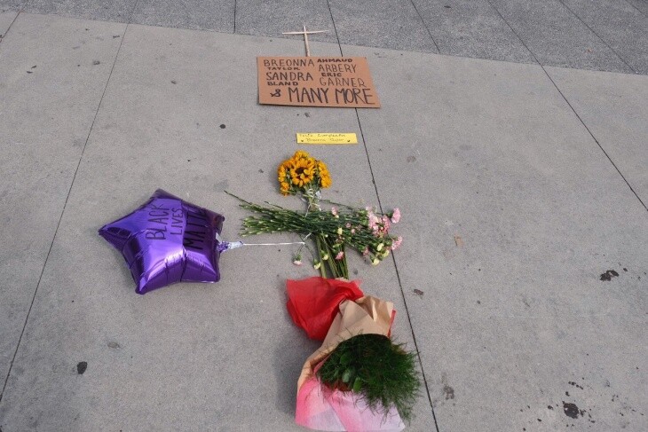 The gathering was peaceful. Blair Sebastian Toles of Van Nuys handed out flowers to protesters, who created makeshift memorials.