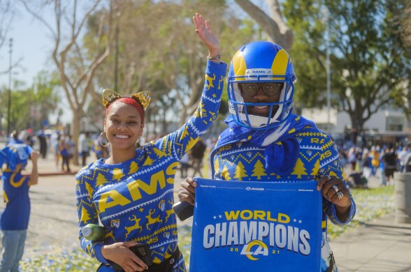 Another fan named Yungg L drove about an hour from the Inland Empire to attend the Rams Championship Parade and Rally. He said he's been a Rams fan since the day he came out of the womb.