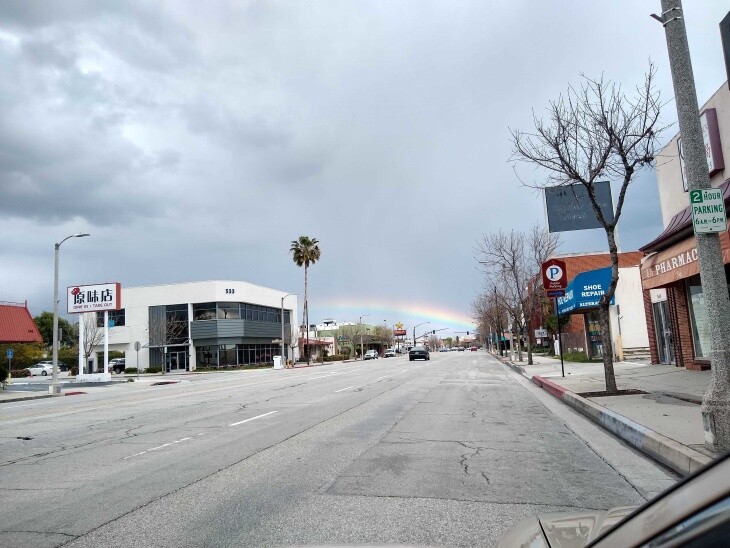Our senior producer for KPCC's AirTalk shot this rainbow on Las Tunas Boulevard in San Gabriel. Fiona Ng, who recently told us about take-out hot pots, reports that her favorite Hong Kong food joint is on the left.