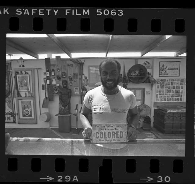 Brian Breye displaying black memorabilia at the Museum in Black in Leimert Park, Los Angeles, Calif., 1984 / Photo courtesy of Leimert Park Beat, from UCLA archives