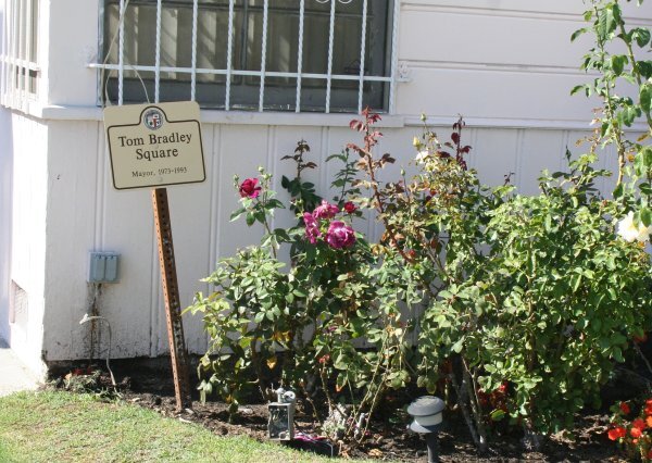 Tom Bradley lived in this humble bungalow for the first few years he was mayor of the city. Talk about keeping it real. Only a sign on the sidewalk and this small sign in the yard mark the location. Nearby, the former 39th Street School was renamed Tom Bradley Elementary.