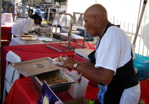 Samuel Bassey serving barbecued chicken to Joan Murray at booth in Leimert Park in Los Angeles, Calif., 1984 / Photo courtesy of Leimert Park Beat, from UCLA archives