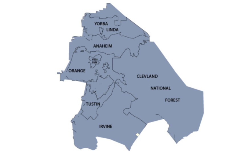The district covers a big swath of central and eastern Orange County, including the cities of Irvine, Orange, Tustin and Yorba Linda. It also includes most of the foothills, including Anaheim Hills, and Silverado and Trabuco canyons, which border the Cleveland National Forest.