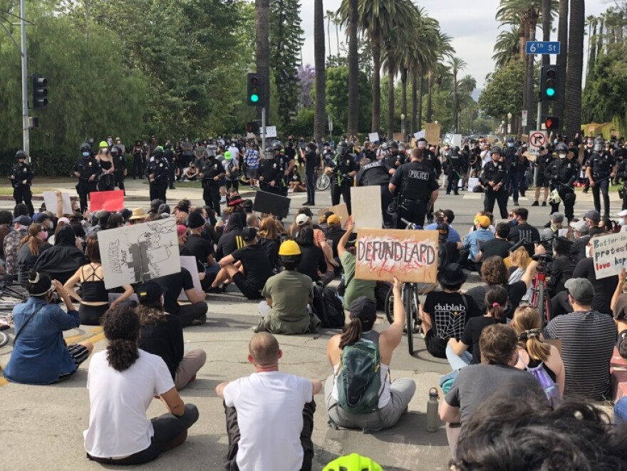 Meanwhile, at the north end of the block, at South Irving Boulevard and West 6th Street, over 100 protesters took a defensive posture, sitting down at the corner of Irving Boulevard and 6th street, facing a line of police in helmets. People holding signs and recording with cell phones chanted "defund the police," "f*** Garcetti" and "[District Attorney] Jackie Lacey must go."