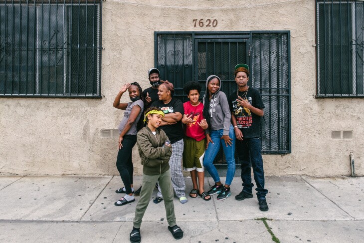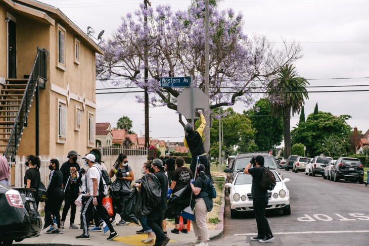More than 400 people spread out along Western Avenue between Florence and Manchester, picking up trash and cleaning graffiti as part of a protest action organized by Diamond Jones, who was born and raised in South Central.