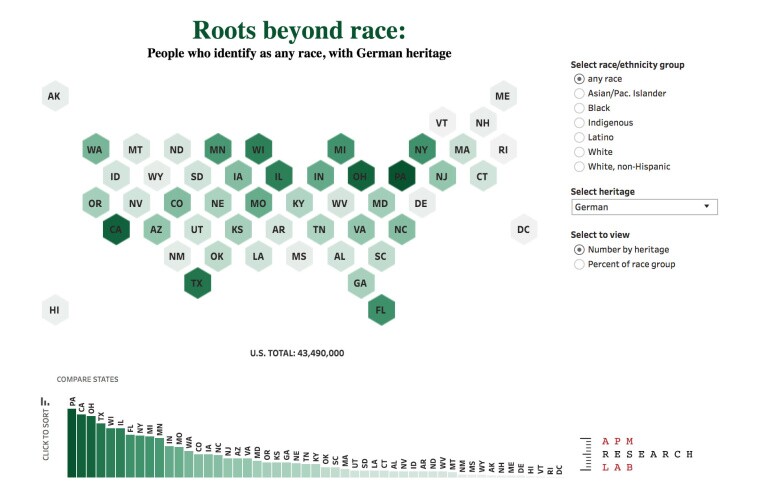 The Roots Beyond Race project -- created by our friends at APM Research Lab -- defines 198 distinct heritage groups pulled from U.S. Census Bureau data. Because the census data is self-reported, it illustrates how Americans across all 50 states see themselves.