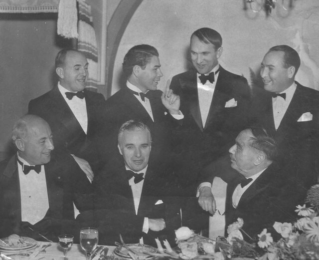 Film industry leaders at a gala testimonial dinner given in honor of H. G. Wells, celebrated British author, and Charles Chaplin, world famed comedian, by the Academy of Motion Picture Arts and Sciences at the Hollywood Roosevelt Hotel on December 4, 1935. Seated, left to right, are Cecil B. DeMille, Chaplin and Wells. Wells, who has spun out thousands of words, said of Hollywood: "It has me speechless. My impressions are still beyond me." (Photo courtesy of the Los Angeles Public Library Photo Collection)