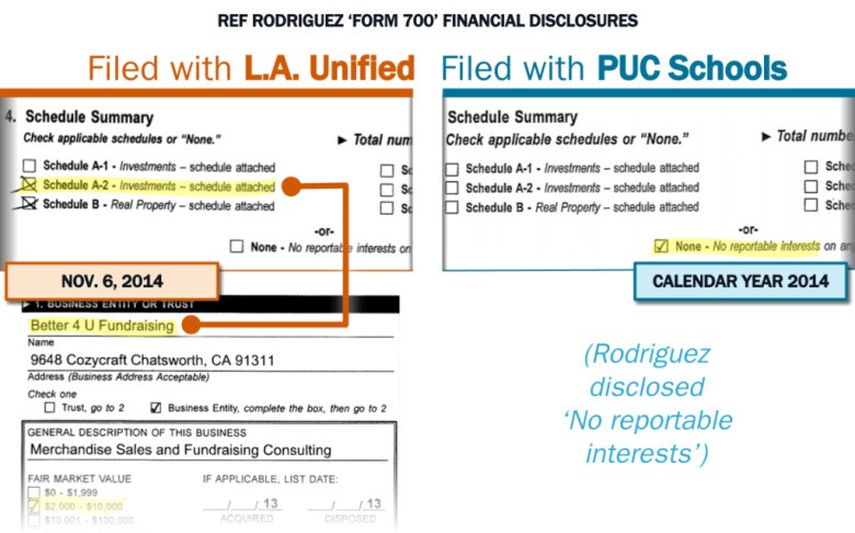 But would PUC Schools leaders have known that at the time? KPCC learned Rodriguez filed another version of his 2014 financial disclosure forms with PUC Schools -- and this version makes no mention of Better 4 You Fundraising, even though it covers almost the exact same period of time.