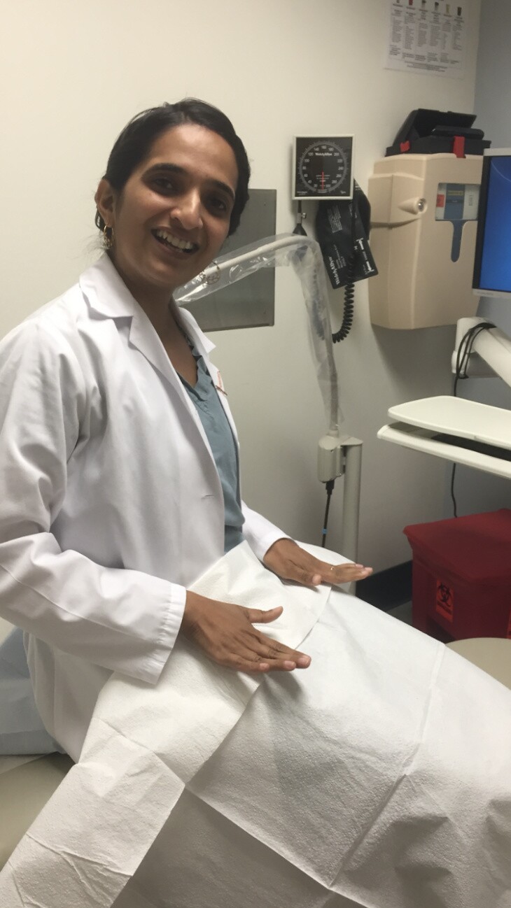 Sridhar asks new patients about menstrual cycles, sexual activity and whether they have any allergies or past surgeries.