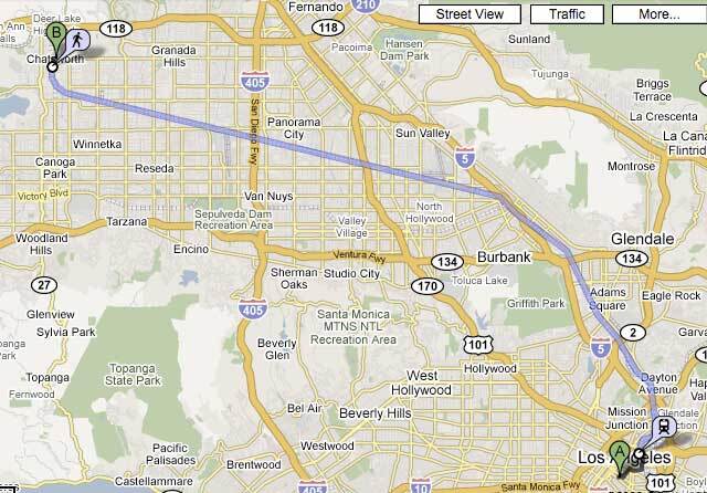 Using Google Transit, a trip from Union Station to Chatsworth on a Metrolink Train