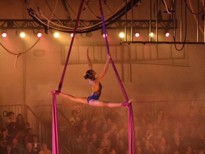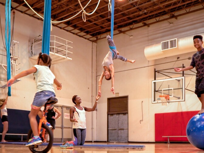 And the Great “Y” is a REAL circus. Here’s a partial list of acts the children have mastered, supplied by Selma, Evander and Olivia Burgess—three members of the troupe: "There’s wire, there’s trapeze," says Evander. "Ribbons, Lear and Hammock," adds Olivia. Evander: "Rolling globes…" Olivia: "German Wheel…" Evander: "Rolla Bolla…" And last but not least, seven year old Selma, who says, "I do swinging ladders and unicycle." As the youngest, Selma is seven, microphone shy. Asked, "What was it like being in the circus with your Mom?," she responds cautiously. "It was cool," she says slowly, and adds after a pause, "I guess." Evander is a thoughtful twelve year old. He gravitates toward support positions, behind the scenes of the show. “I feel proud," Evander says. "Because my helping them is actually working.” And then there’s Olivia. At thirteen, she’s very much the oldest child, remarkably self-assured at an awkward age. Asked what the circus has taught her, she's decisive and firm. "Trust," she says. "I’ve learned to trust people. Because when they’re swinging you in the air you have to trust them." Olivia does Ribbon—an aerialist spinning high above the gymnasium floor on long silk in a graceful dance with risk. She bats away a compliment like Serena Williams batting away a slow serve. “It’s not natural ability—at all. Just like when people say their kids were born smart? They practice, they study, every day. They work on it 24/7.”