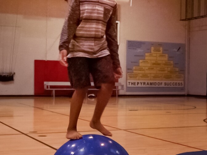 There are 350 young performers, plus 50 adult trainers and a small army of show crew. Visible grace notes are everywhere. Hugs and laughter. Teenagers, spinning like human hubcaps inside life-sized rings called German Wheels. Grown-ups teach children juggling moves, or rehearse for rapt kids on the Rolla Bolla, a skateboard-sized teeter-totter perched on a cylinder as big as a human thigh. “All the trainers are volunteers, so none of us get paid," says Assistant Trainer Tim Caldwell. "We have to sign on for a nine month process." Caldwell has been with working with kids at the Great “Y” Circus for fifteen years. “They learn to come out here without worrying if they’re going to win a first place medal, or win the game. You don’t have to defeat anybody to feel good about yourself. Every one of them does the best they can, and that’s good enough.” The PA sounds.