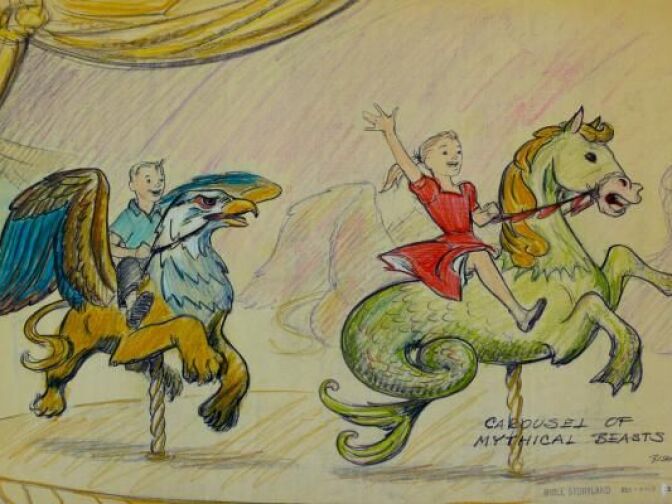 "Take Noah's Ark, a double carousel. It would be a typical carousel, but built inside a large ark and filled with zebras and camels going around the carousel. That's a very biblical theme, of course. But to the left of it is the 'Carousel of Mythical Beasts'. You see this girl riding on a half horse, half mermaid, with dragon feet. The mythical beasts! I never found that in the bible myself."